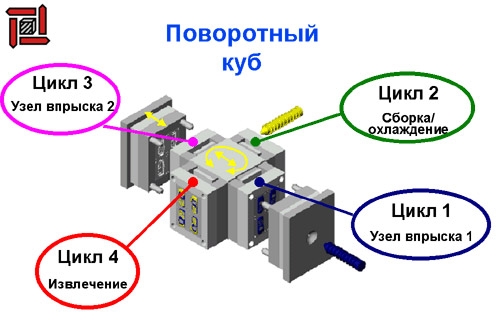 Кроме того существует технологии этажных форм, технология « поворотный куб» и другие примеры высокопроизводительных технологий, требующих специальных термопласт-автоматов.